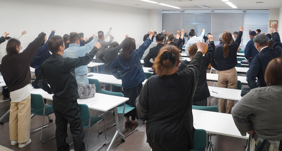 日程や任務については、山本五十六・県連書記長が提案し、確認。松山マツ子・県連女性部長が閉会あいさつし、「力を結集させ、集会の成功を」と訴え、団結がんばろうをおこなった。