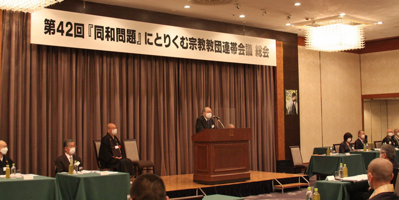 『同和問題』にとりくむ宗教教団連帯会議は4月19日午後、京都市内のホテルで、第42回総会をひらいた。新型コロナウイルス感染症対策のため、開催規模を縮小し、36加盟教団、全日本仏教会など3協賛団体の代表、およそ80人が出席した。