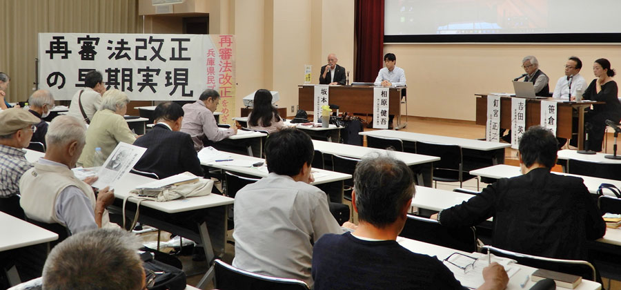 主催は再審法改正をめざす兵庫県民プロジェクト。同プロジェクトは今年4月に立ちあげられ、6月には第1弾となる集会を開催したほか、県内自治体にたいして「再審法」改正を求める意見書採択運動にもとりくんできた。9月末時点で県内16市町が意見書を採択したことも集会で報告された。